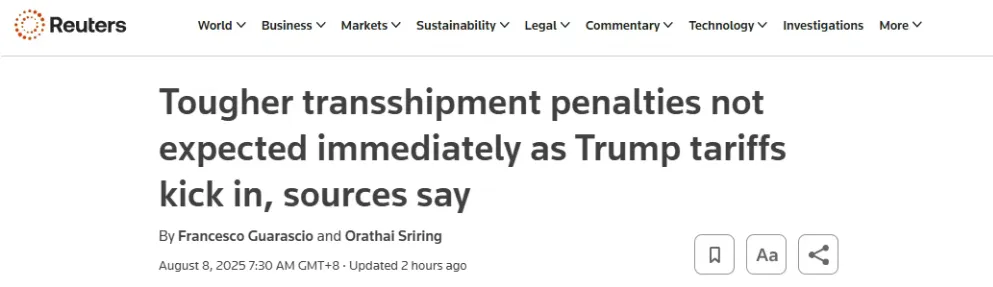 On August 8th local time (US time), Reuters reported that it was like throwing a stone on the lake of international trade, causing ripples: although the United States has officially launched a new round of tariff measures on goods from multiple countries, the additional 40% punitive tariff imposed on "goods transshipment for tax avoidance" will not be immediately implemented in the short term.